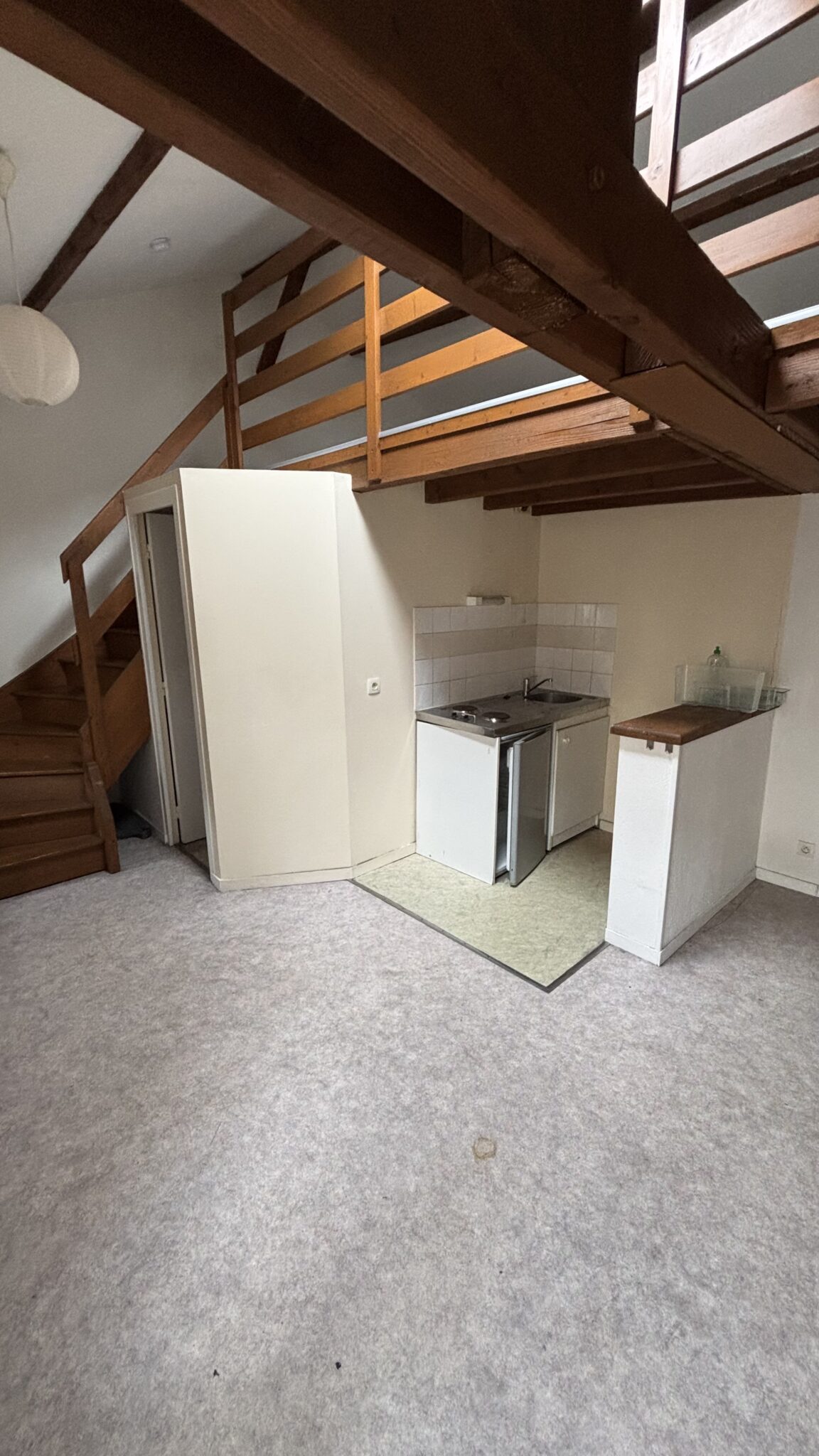 Appartement en duplex en bon état dans un immeuble calme situé au 3ème étage, composé d’une kitchenette équipée (plaques de cuisson, réfrigérateur, rangements, évier) ouverte sur pièce de vie, salle de bains avec WC.