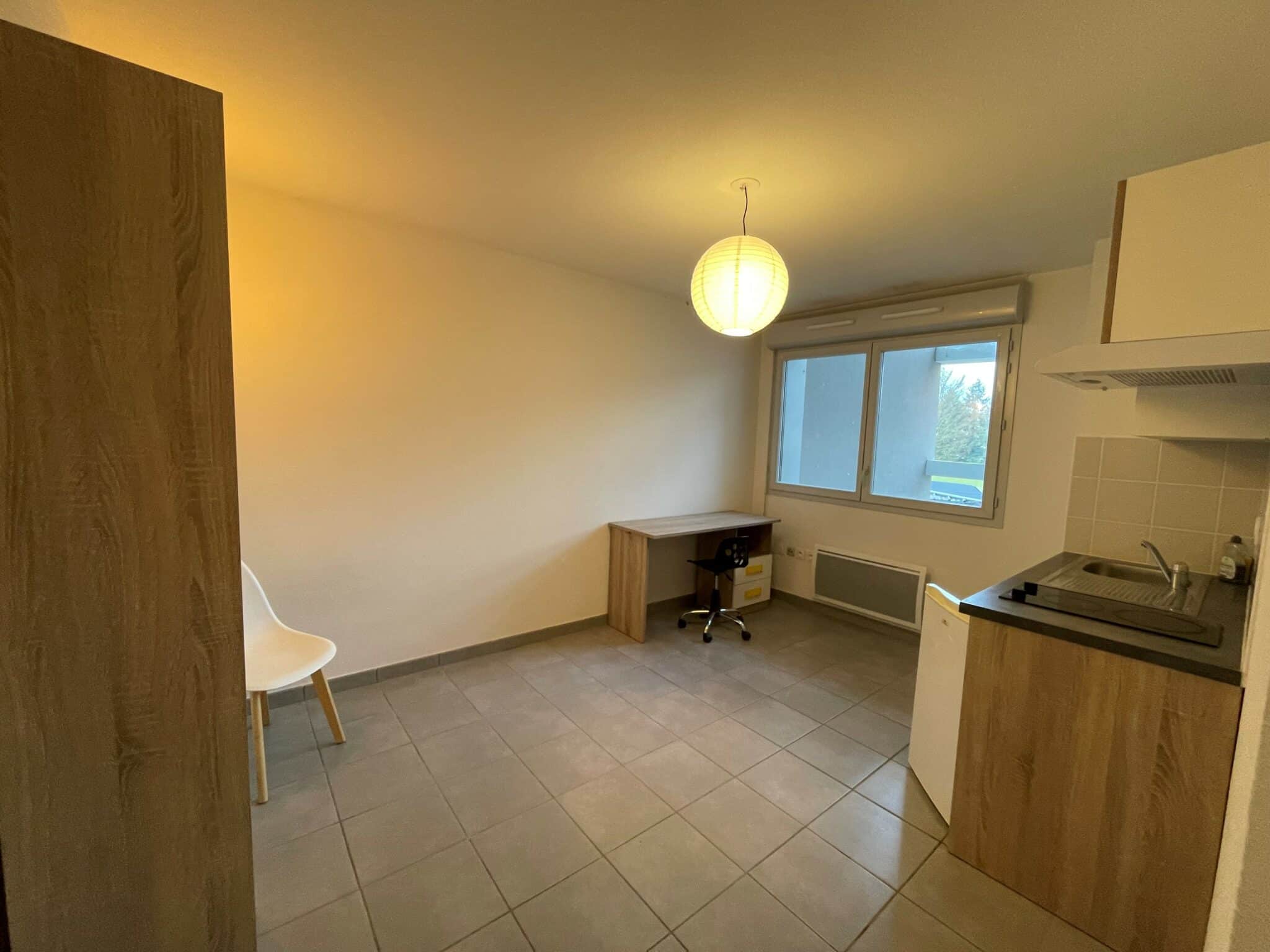 L’appartement est composé d’une entrée avec grand placard, d’une cuisine équipée (évier, réfrigérateur, plaque de cuisson vitrocéramique, hotte et rangements) ouverte sur un séjour lumineux composé d’un bureau + chaise et d’une étagère et d’une salle d’eau avec sèche serviette, WC.